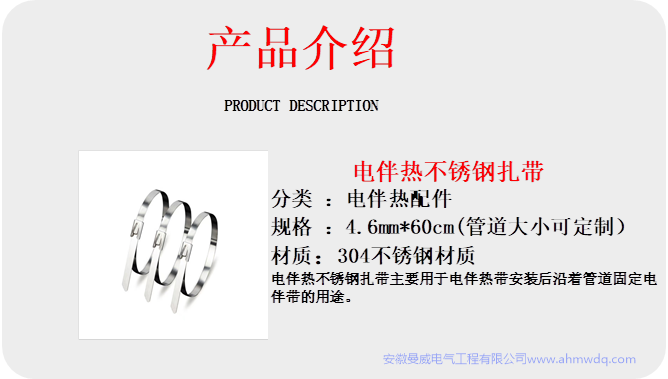 不銹鋼卡扣和調節螺絲所組成的,它用于防爆電源接線盒等附件在管道上的固定。鋼帶可根據管徑大小按實際固定長度的1.1倍剪切。再將調節螺絲的前后端分別固定在兩頭的小孔內,擰緊調節螺絲即可。